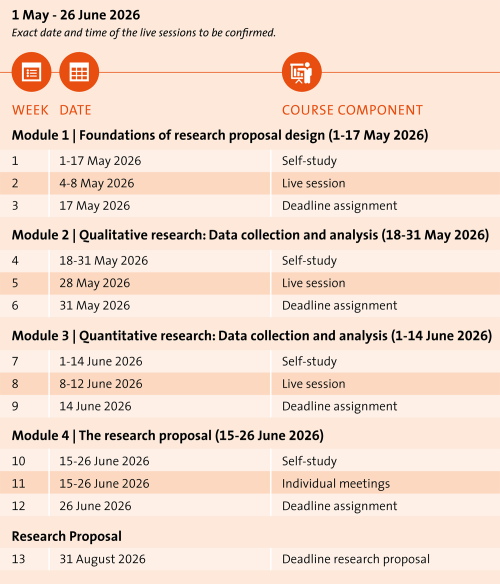 The modules include one or more assignments. These assignments will attribute to completing the research proposal. In addition, you will receive feedback on the assignments during the live sessions. The course will be completed with the successful completion of the research proposal. The completion of the assignments and a pass-level grade of the research proposal is necessary in order to obtain the certificate.