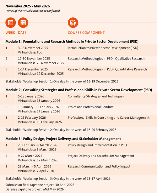 - Network: Participants will build a powerful professional network with industry leaders, consultants, policymakers, and academics, opening doors to future collaborations, career opportunities, and impactful projects in the field of Private Sector Development.