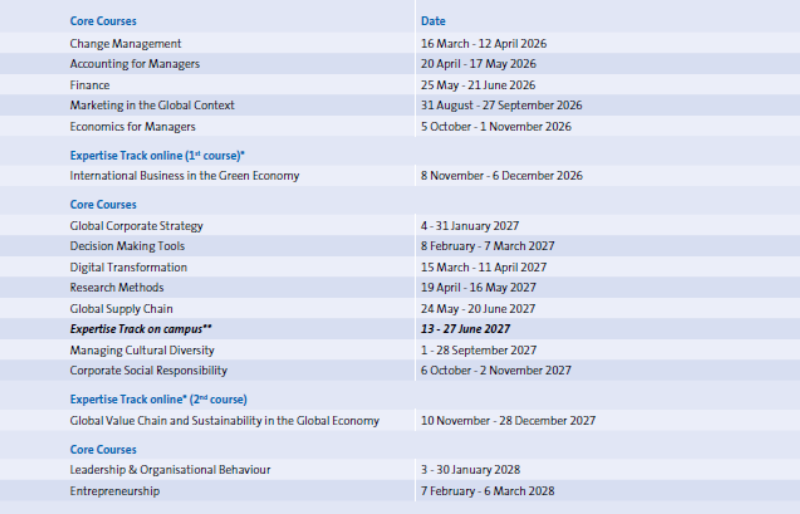 **Participants can choose to follow the specialisation (expertise tracks) courses on-campus during the MBA Summer School at MSM in Maastricht. Following specialisations (expertise tracks) are offered on-campus: Entrepreneurship, Sustainable Business in the Global Economy, Finance and Accounting, The Digital Economy, Supply Chain Management, Innovative Leadership, Global Business Dynamics, Healthcare Management, The MBA Summer School takes place each year in June/July.