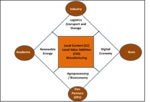 - Stimulate a broad transformation agenda: Achieving economic transformation lies in building strong clusters of interrelated industries based on the local endowments and national ambitions. While critical minerals are the key resource of interest, agriculture is the foundation of many economies in Africa. The CRM driven transport corridors should be a backbone for manufacturing clusters (especially agroprocessing), industrial parks, free-trade zones, and integrated logistics. This will be best achieved through building skills, building entrepreneurship, and also a strong innovation ecosystem. The model that will support this is a quadruple helix partnership (Q-Helix) where governments, the private sector, academia, and development partners (including civil society) work closely together to drive local economic development (LED). This is shown in Figure 1.